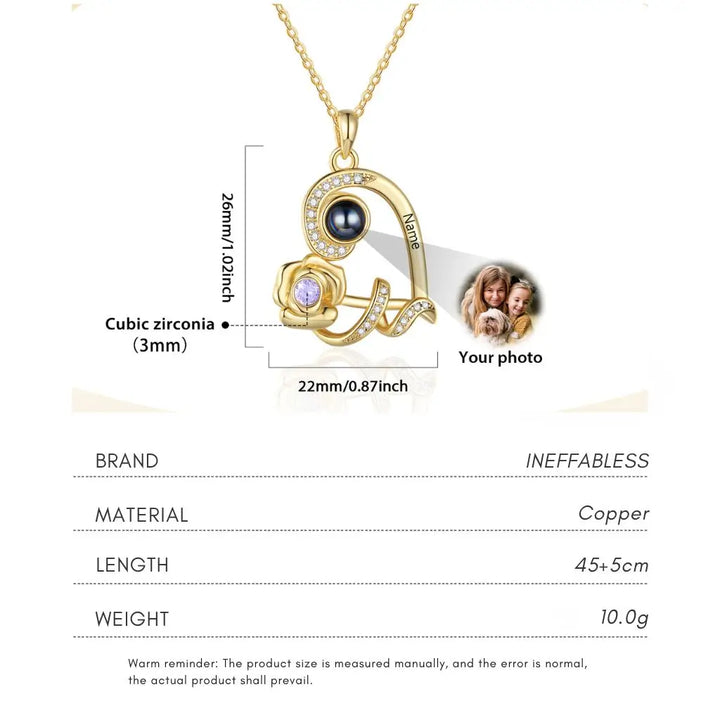 Personalised Heart Rose Photo Projection Necklace with Name Engraving & Birthstone